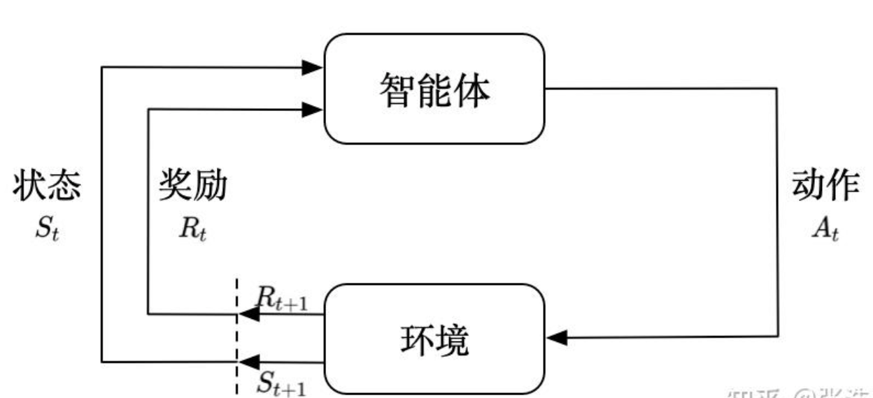在强化学习过程中,智能体跟环境一直在交互。智能体在环境里面获取到状态,智能体会利用这个状态输出一个动作,一个决策。然后这个决策会放到环境之中去,环境会根据智能体采取的决策,输出下一个状态以及当前的这个决策得到的奖励。智能体的目的就是为了尽可能多地从环境中获取奖励。