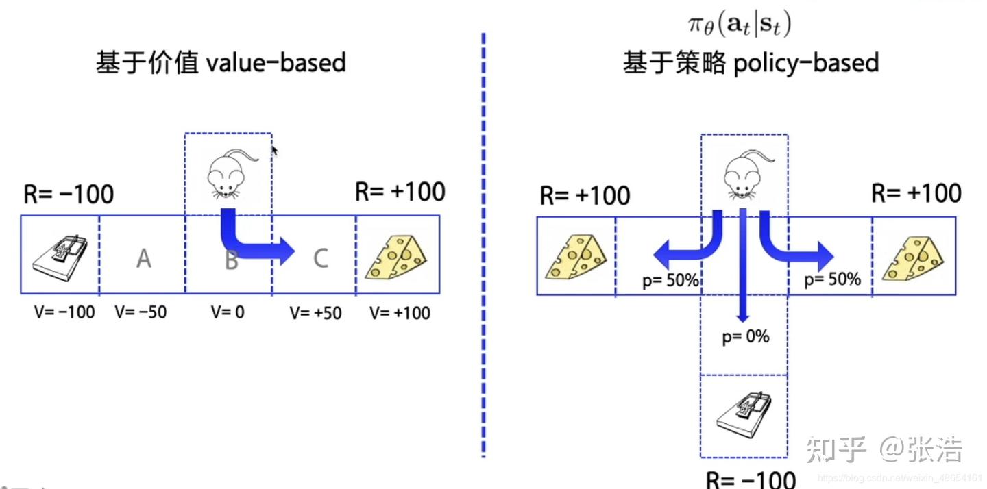 Policy-Based的方法直接输出下一步动作的概率,根据概率来选取动作。但不一定概率最高就会选择该动作,还是会从整体进行考虑。适用于非连续和连续的动作。常见的方法有Policy gradients。