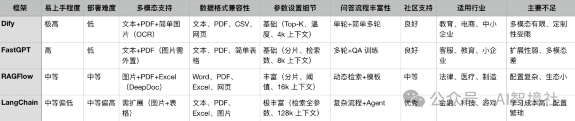 RAG 框架种类繁多,从国际知名的 LangChain 到国内新兴的 Dify,各有千秋。为帮助读者准确决策,我们选取 Dify、FastGPT、RAGFlow 和 LangChain 进行深入分析和对比。以下将分析其特点、优势与不足,并结合适用行业和场景提供建议。