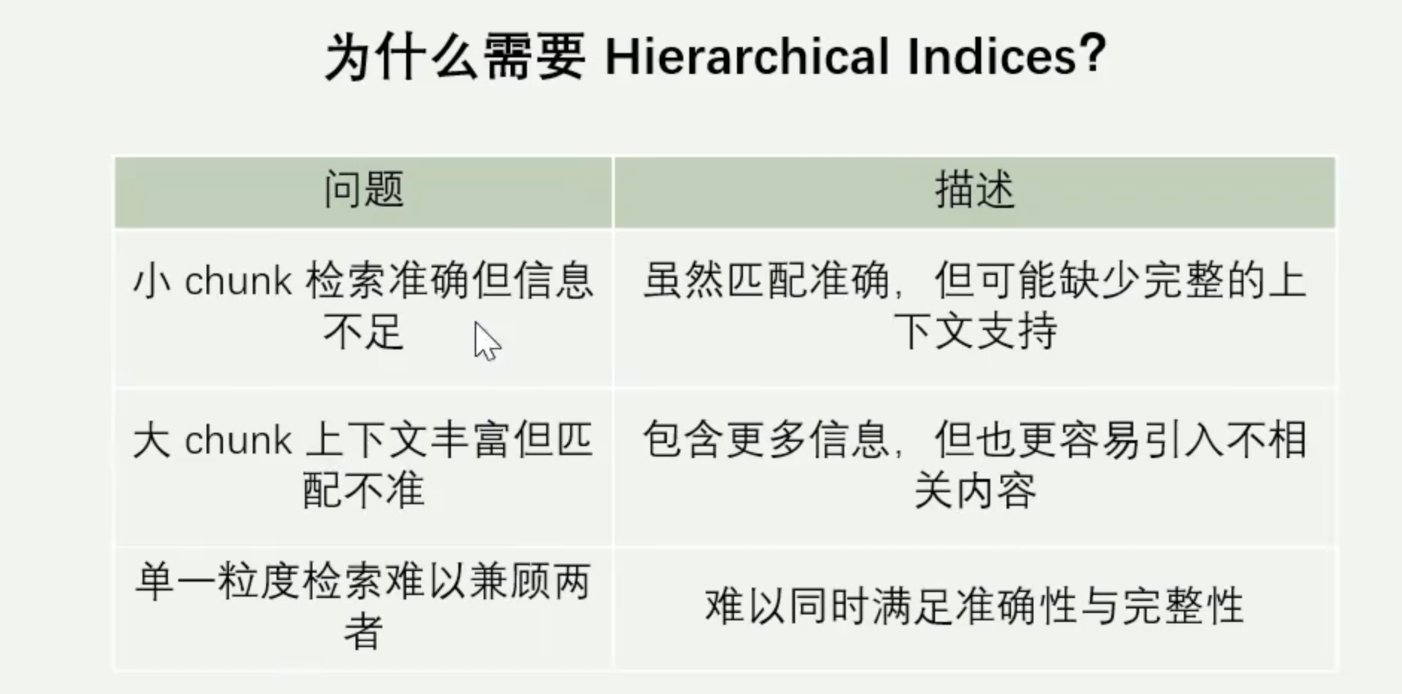 核心思路:结合小块的精准匹配与大块的上下文完整性。 将文本数据按不同粒度组织成“多级索引”的方式,先用大块进行初步检索,再用匹配的大块中进一步细化检索,从而实现精度与上下文之间的平衡。