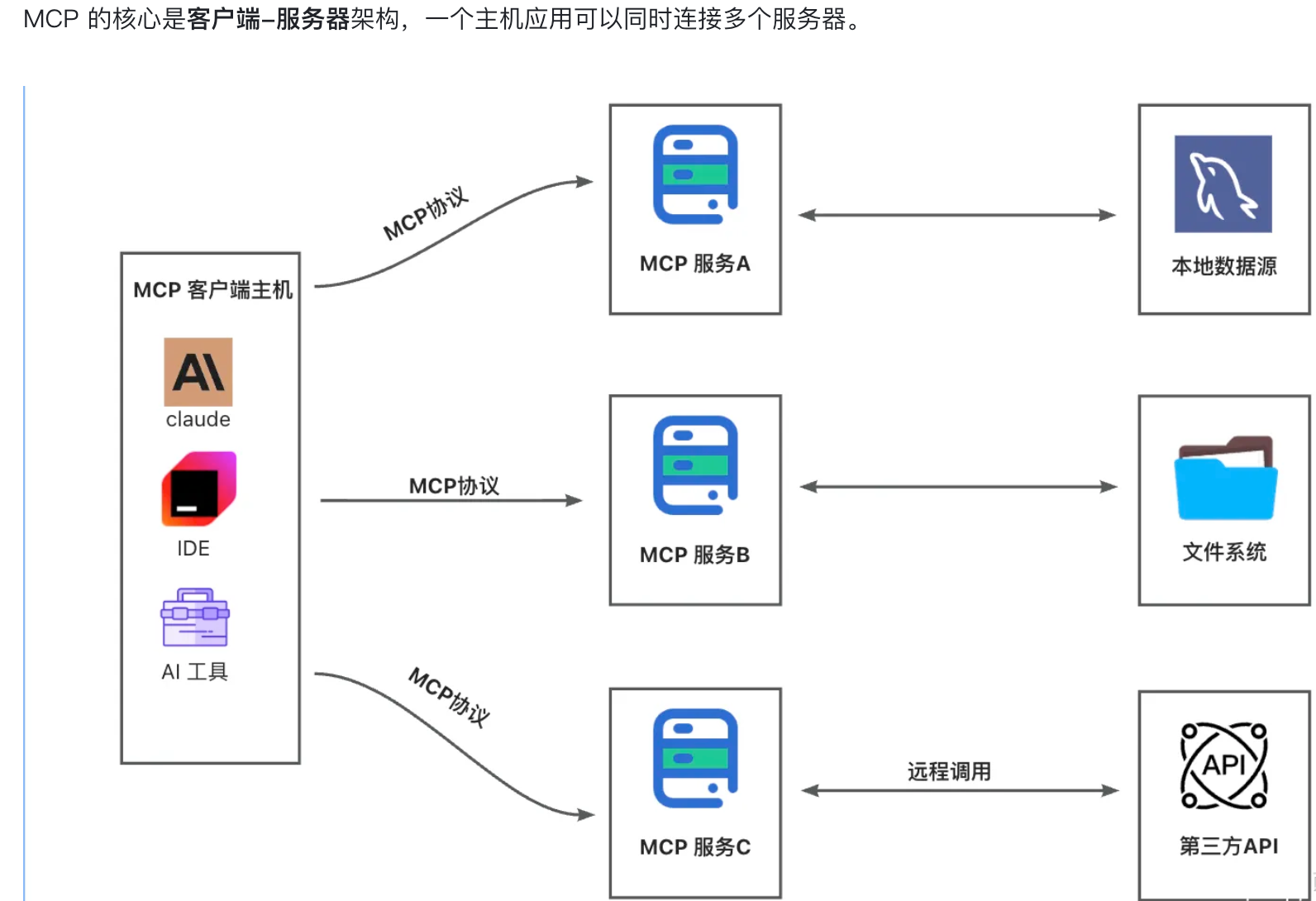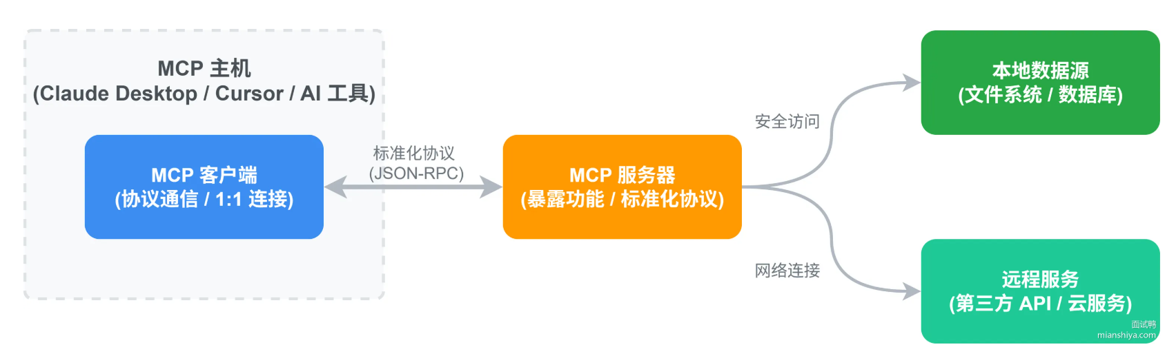 MCP 采用经典的 Client-Server 架构: