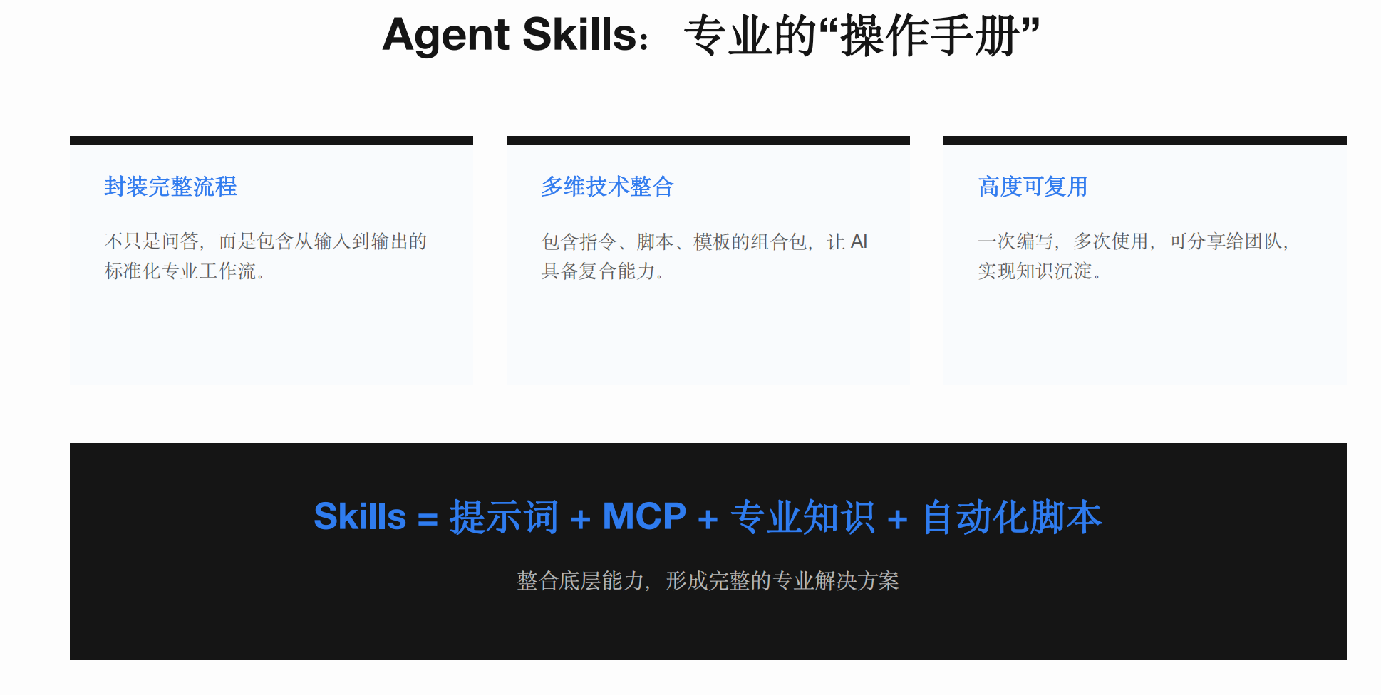 Agent Skills 就像一份“带目录的说明书”当然为了更好的理解,你可以把 Skills 理解为“通用 Agent 的扩展包” 。更专业地说,它是一种渐进式披露的提示词管理机制。