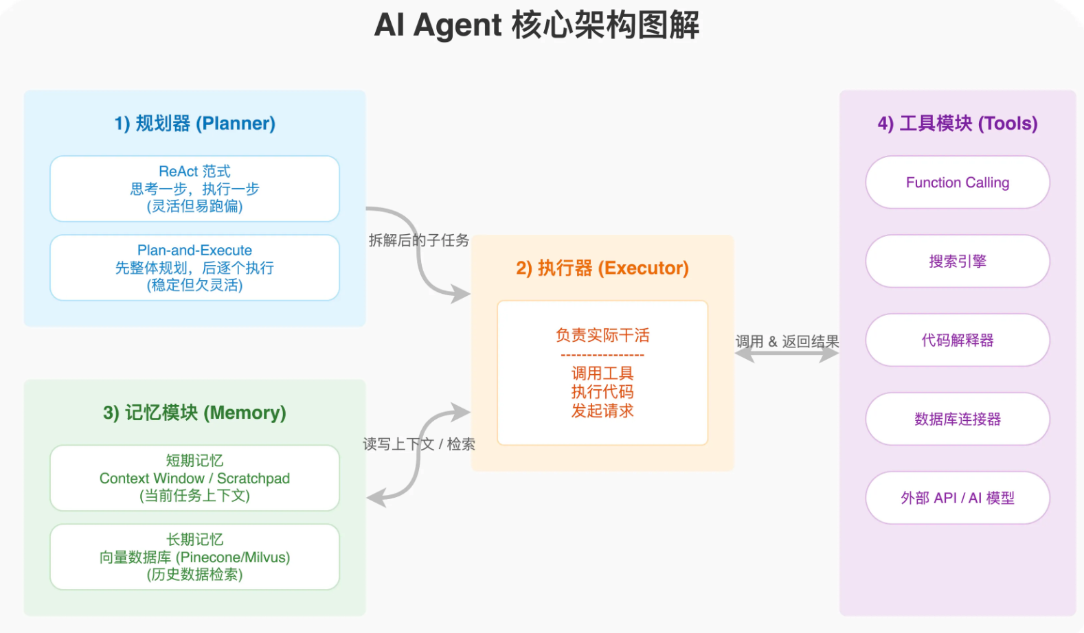 2)执行器(LLM)负责实际干活,调用工具、执行代码、发起请求。