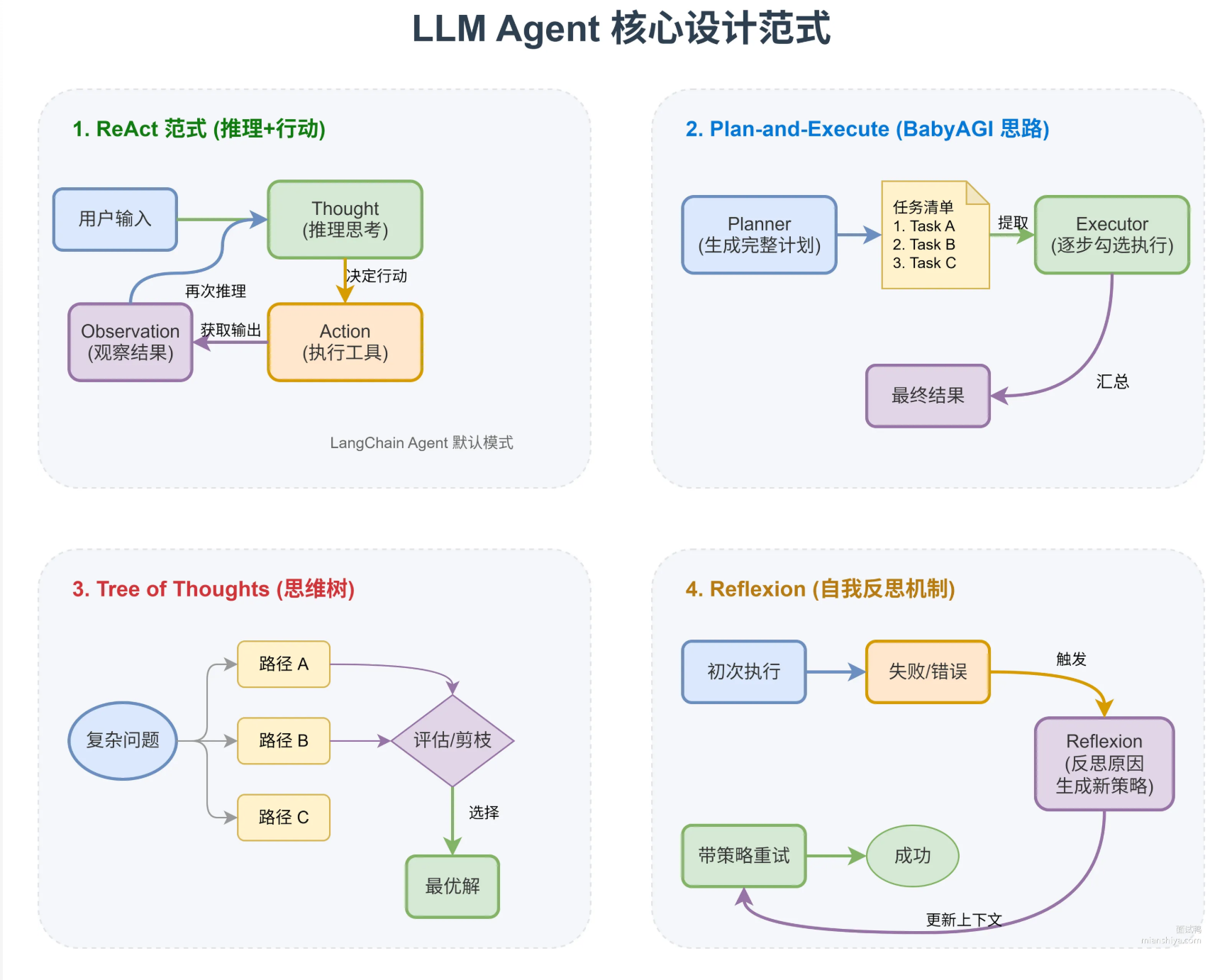 1)ReAct 范式把推理和行动交替进行。先 Thought 说明要做什么、为什么,再 Action 执行具体操作,然后 Observation 观察结果,循环往复。LangChain 的 Agent 默认就是这种模式。