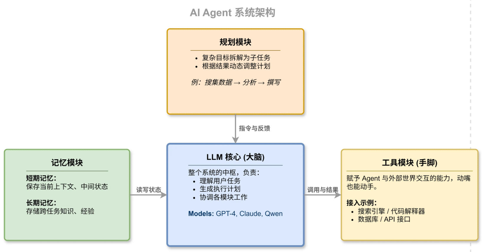 1)LLM 核心是整个系统的大脑,负责理解任务、生成计划、协调各模块工作。GPT、Claude、Qwen 这些大模型都可以充当这个角色。